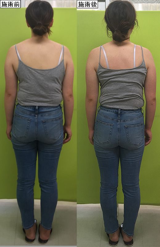 施術前のうしろですが、骨盤のゆがみのためウエストのくびれが無いように見えてしまっています(^_^;)