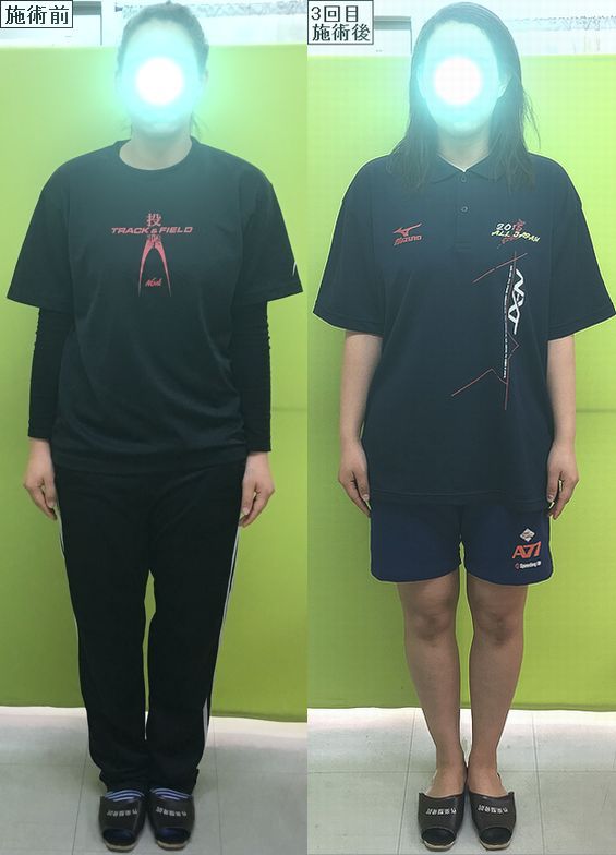 続いて正面ですが、骨盤矯正後の身体のゆがみやウエストのくびれ