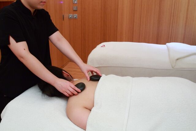 (画像はイメージです。実際には施術衣の間からホットストーンを差し込んで施術をさせていただきます。)
