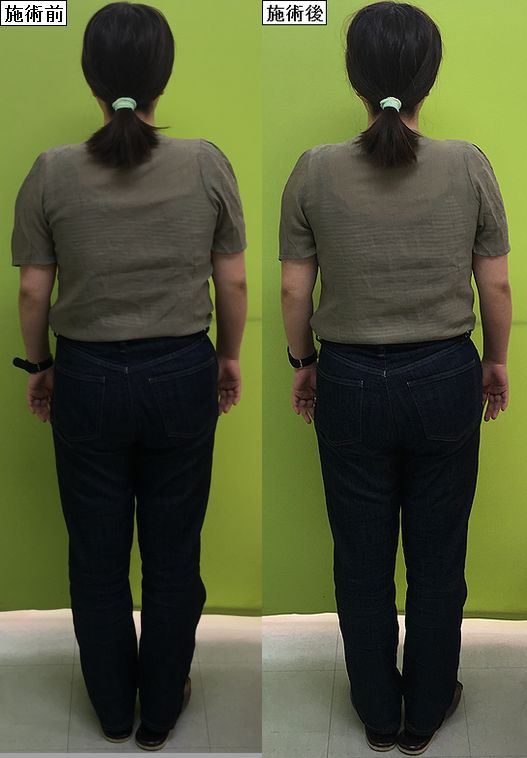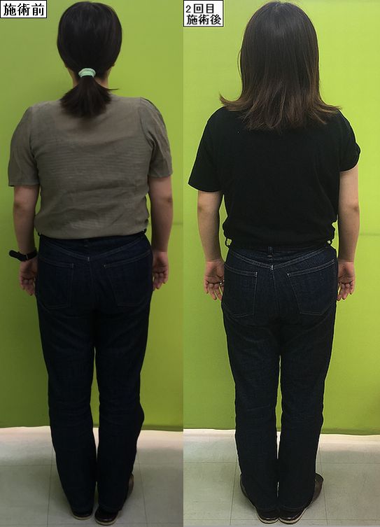 最後は後ろですが、姿勢矯正後の身体のゆがみや、骨盤矯正後のウエストのくびれやヒップの感じ、O脚矯正後の脚のゆがみを比べてくださいねー☆ミ