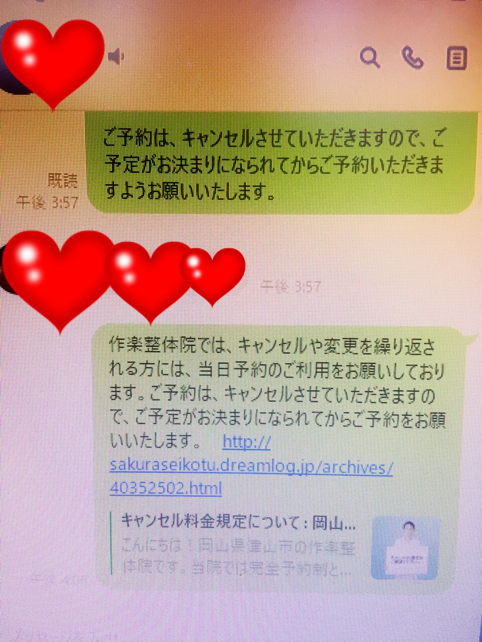 作楽整体院は、料金の発生しないキャンセルを繰り返し、他のお客様のご予約をお受けできなくする、迷惑行為を行う方に、振り回される事をしないことに決めました。