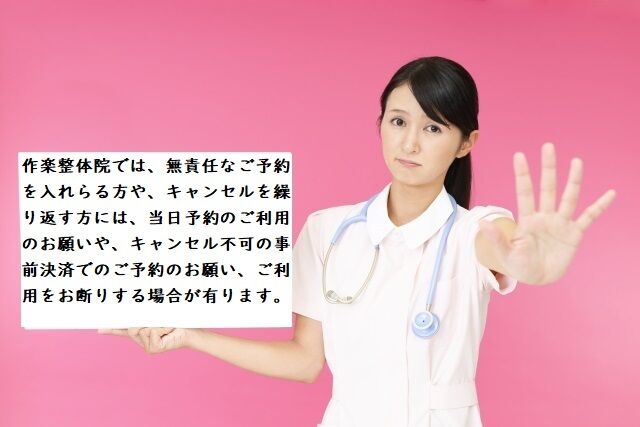 作楽整体院では、無責任なご予約を入れられる方や、キャンセルを繰り返される方に対し、当日予約や、キャンセル不可の事前決済のお願いや、ご予約自体をお断りするケースが有ります。