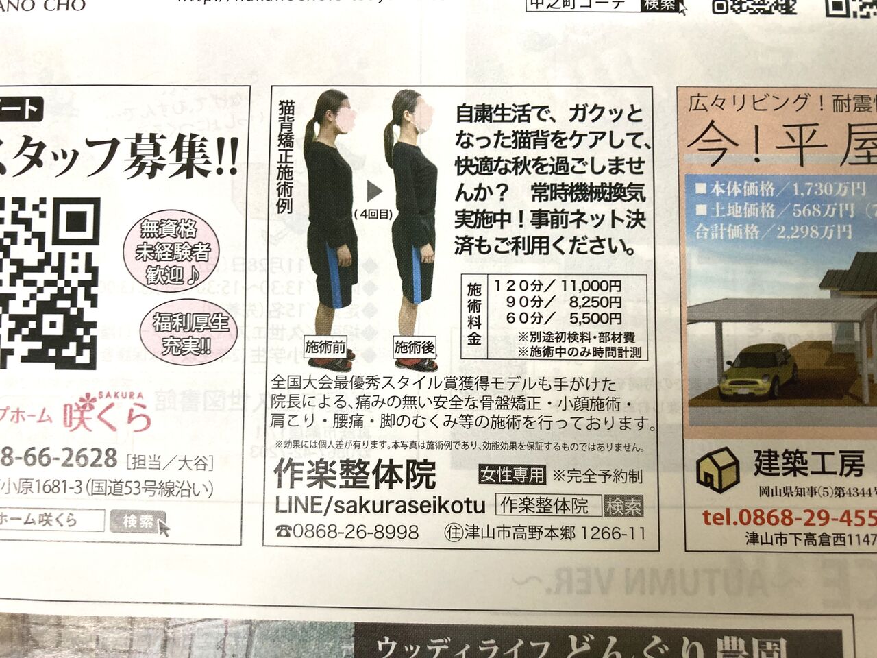 折り込みだけでなく、津山市内や勝央町・鏡野町・美作市・西粟倉村・真庭市・美咲町・久米南町・奈義町等の県北各地の図書館や書店・イオンやyumeマート等のスーパーやローソン等のコンビニ、ガストなどのファミレス、ツタヤ等にも設置され、各地のアパートやマンション等にも随時ポスティングされます。山陽新聞をお取りでない方もご覧くださいねー(^O^)/作楽整体院は、女性専用・完全予約制です!ご予約後にお越しください!