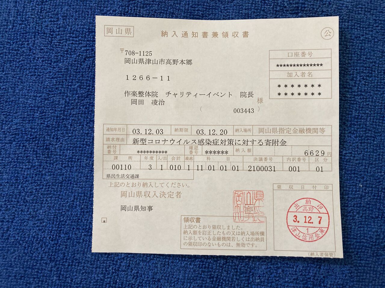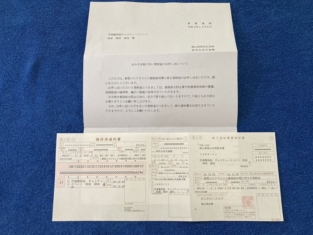 「新型コロナウイルス感染症対策おかやま助け合い寄附金」に、寄付させていただきました。