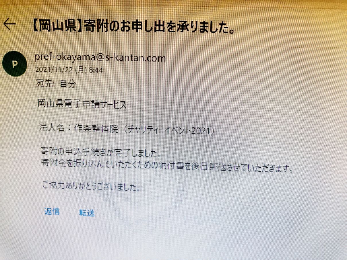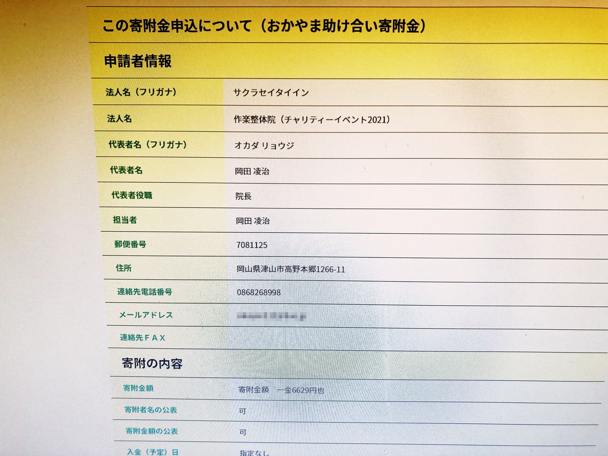 「チャリティーオンラインイベント」の際、石瀬先生やお客様にご協力いただいた募金や、作楽整体院の寄付分は、院長が責任をもって、寄付させていただきました!