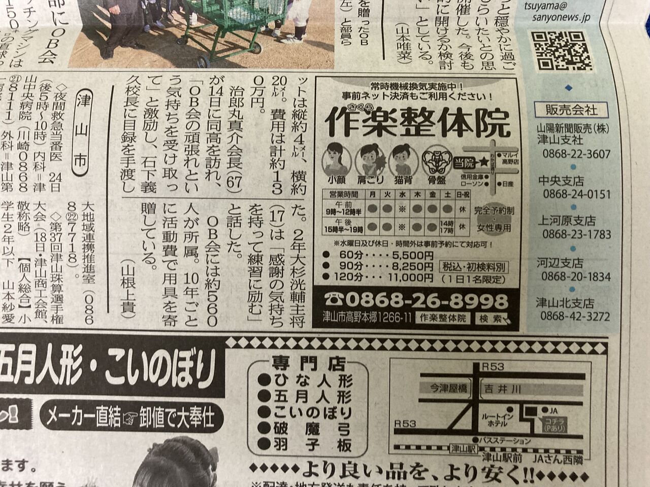 本日12月24日金曜日の山陽新聞作州ワイド版に、紙面広告掲載してます!・津山市の新聞掲載整体院