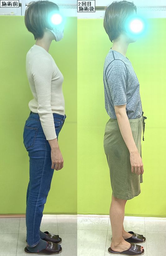 まずは横から!猫背矯正後の背中の丸さや、骨盤矯正後の反り腰と下腹の突き出し具合を比べてくださいねー♪