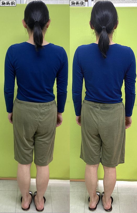 最後はうしろですが、猫背矯正後の猫背や背中のスッキリした感じ、姿勢矯正と骨盤矯正後のウエストのくびれや身体の傾き方、O脚矯正とリンパケア整体後の脚のゆがみをやむくみを比べてくださいねー☆ミ