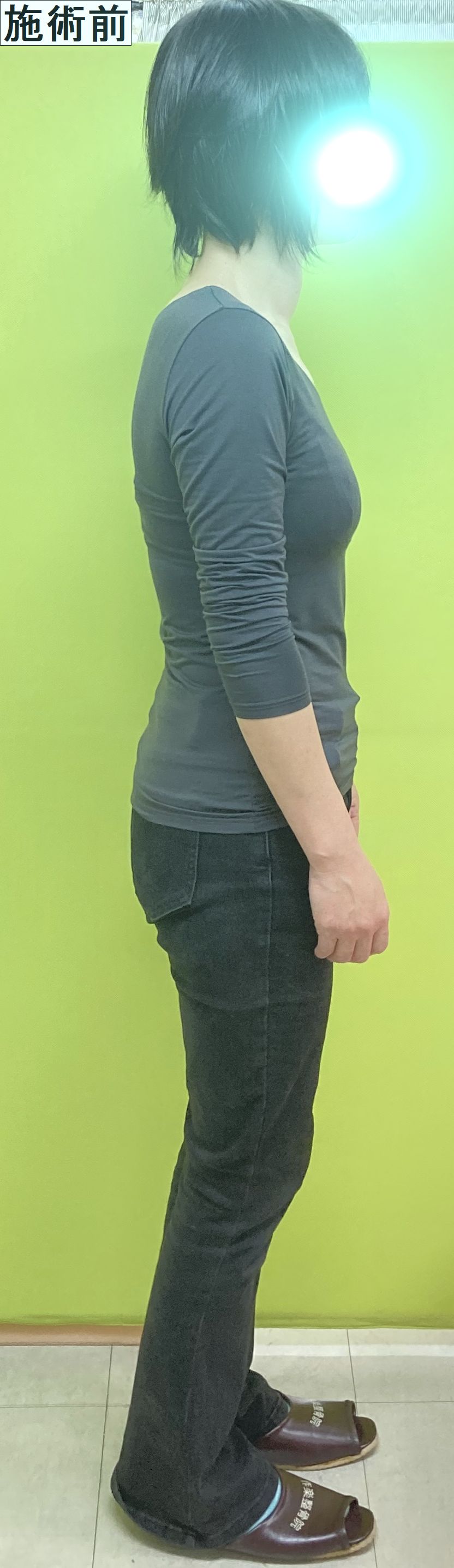 施術前の横ですが、猫背や巻き肩・ストレートネックになり、背中が丸くなり、下を向いたような姿勢になってしまっています(^-^;