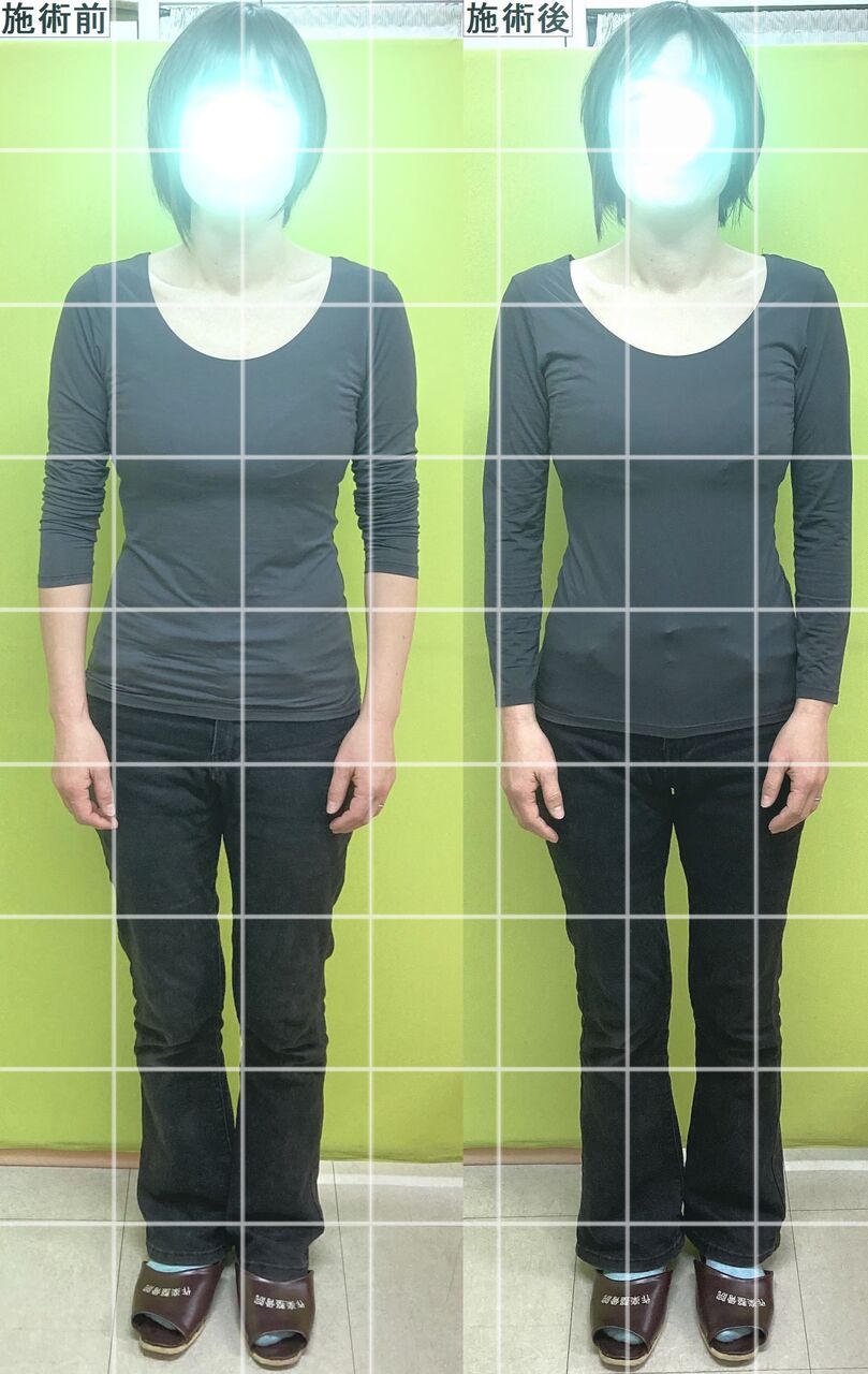 続いて正面!猫背矯正後の猫背や鎖骨の感じ、姿勢矯正や骨盤矯正後の骨盤と姿勢のゆがみ・O脚矯正後の脚のゆがみを比べてくださいねー♪