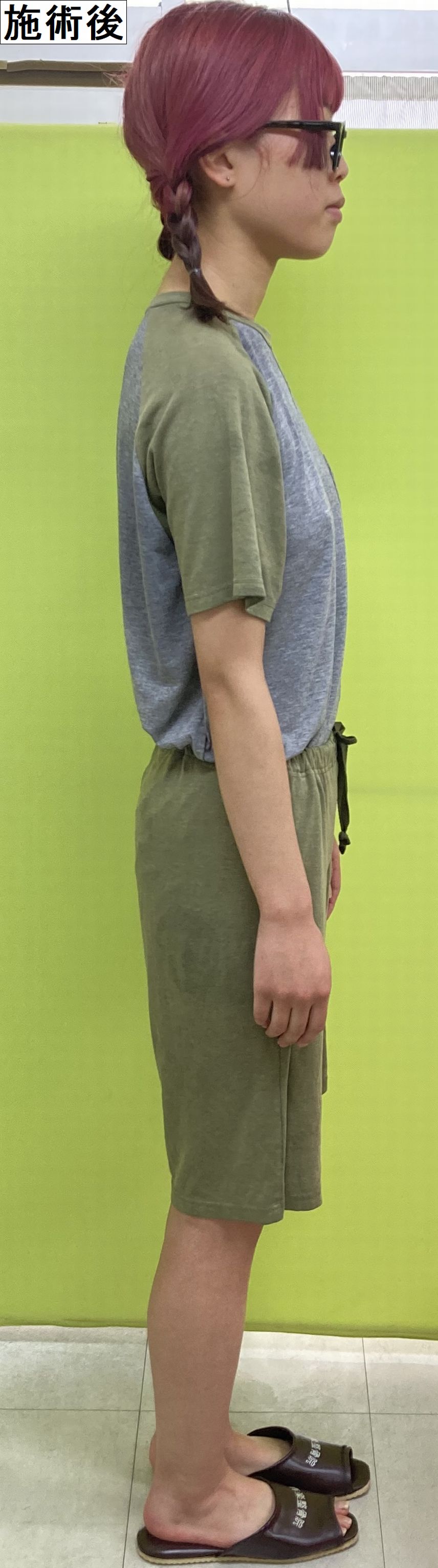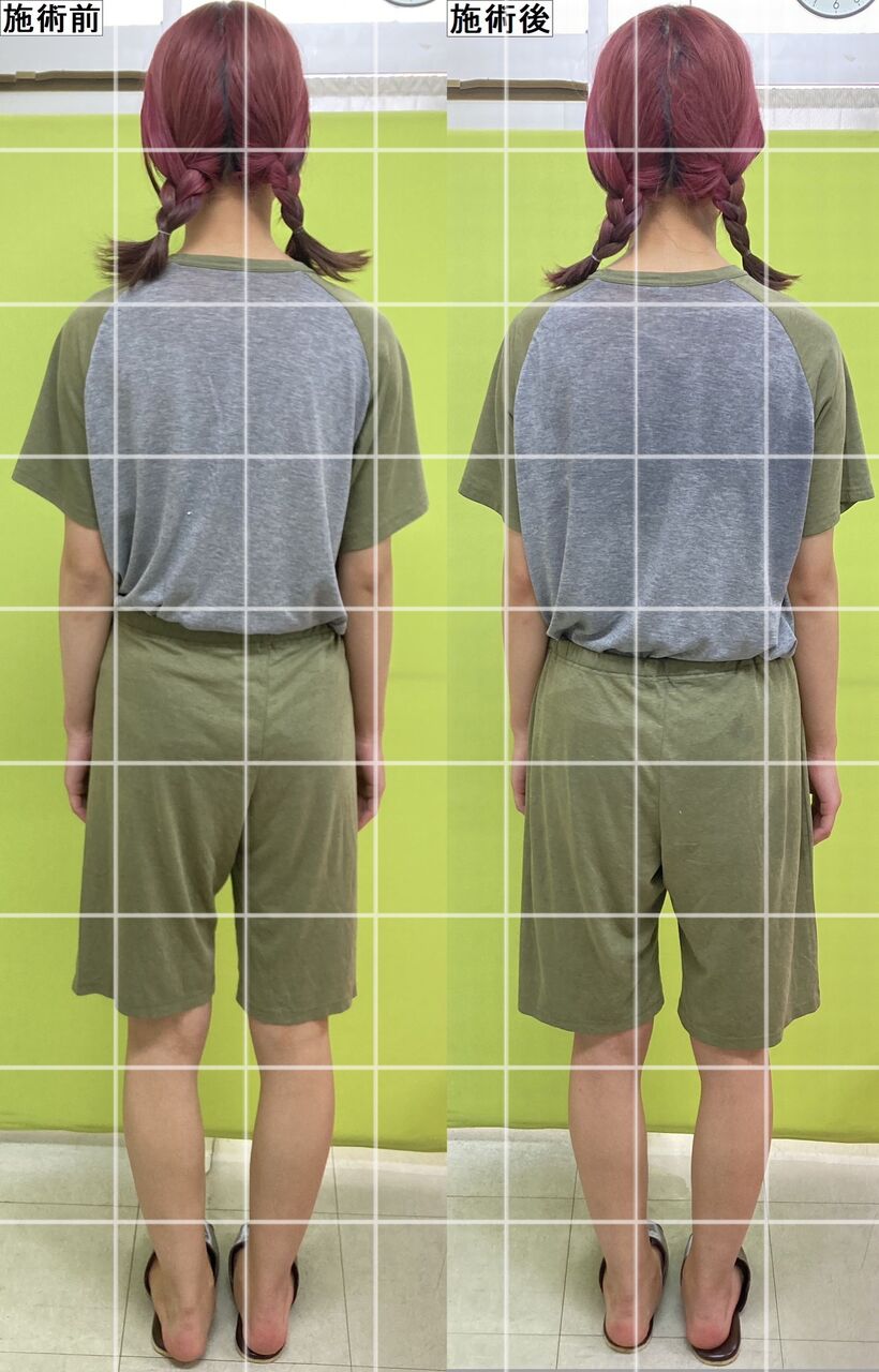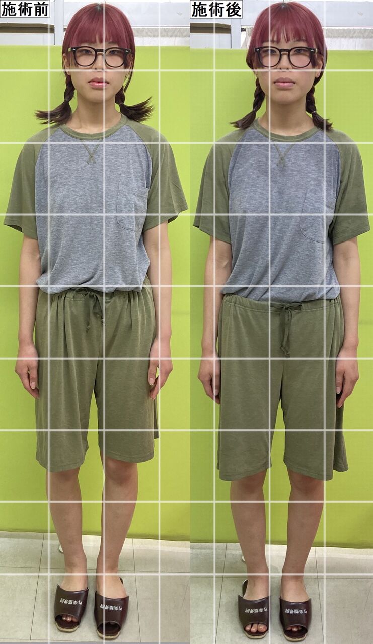 続いて正面!猫背矯正後の猫背や巻き肩、姿勢矯正や骨盤矯正後の骨盤と姿勢の傾き・O脚矯正後の脚のゆがみを比べてくださいねー♪