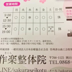 作楽整体院は、平日19時スタートまで受け付けております!また20時スタートまで、特別施術も対応してます!お仕事帰りの方もご予約ください!
