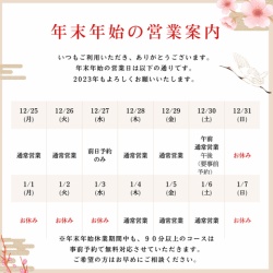 年末年始の営業は30日午前中まで通常営業、30日午後は前日予約のみ対応、31日~3日まで休業の予定です。休業期間の特別施術はご予約可能です、お早めにご相談ください!
